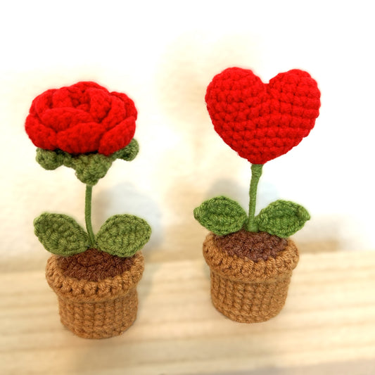 Blossoming Love - Handmade Crochet Knitted Potted Plant - Heart and Rose Bundle 2PCS - Gift for Valentine's, Birthday, Mother's Day, Office/Home Decor